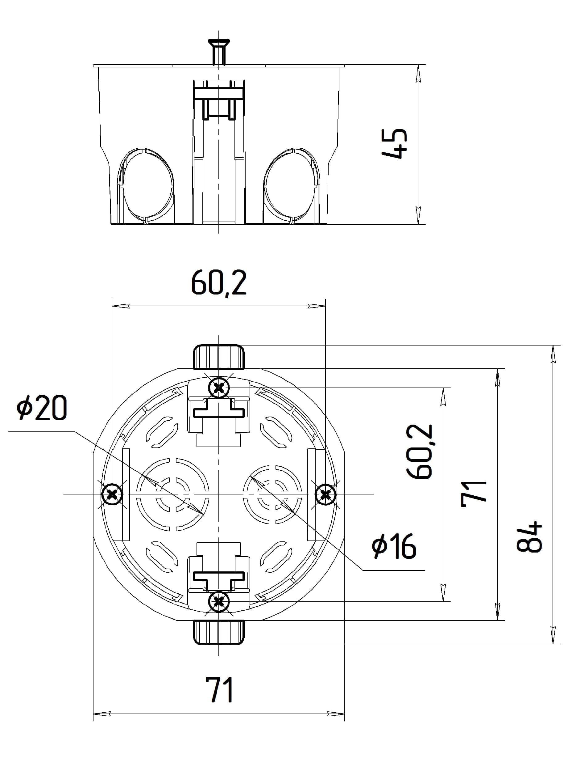 При использовании крышки коробку можно применять в качестве распаячной (разветвительной) коробки для развода кабеля и проводов.