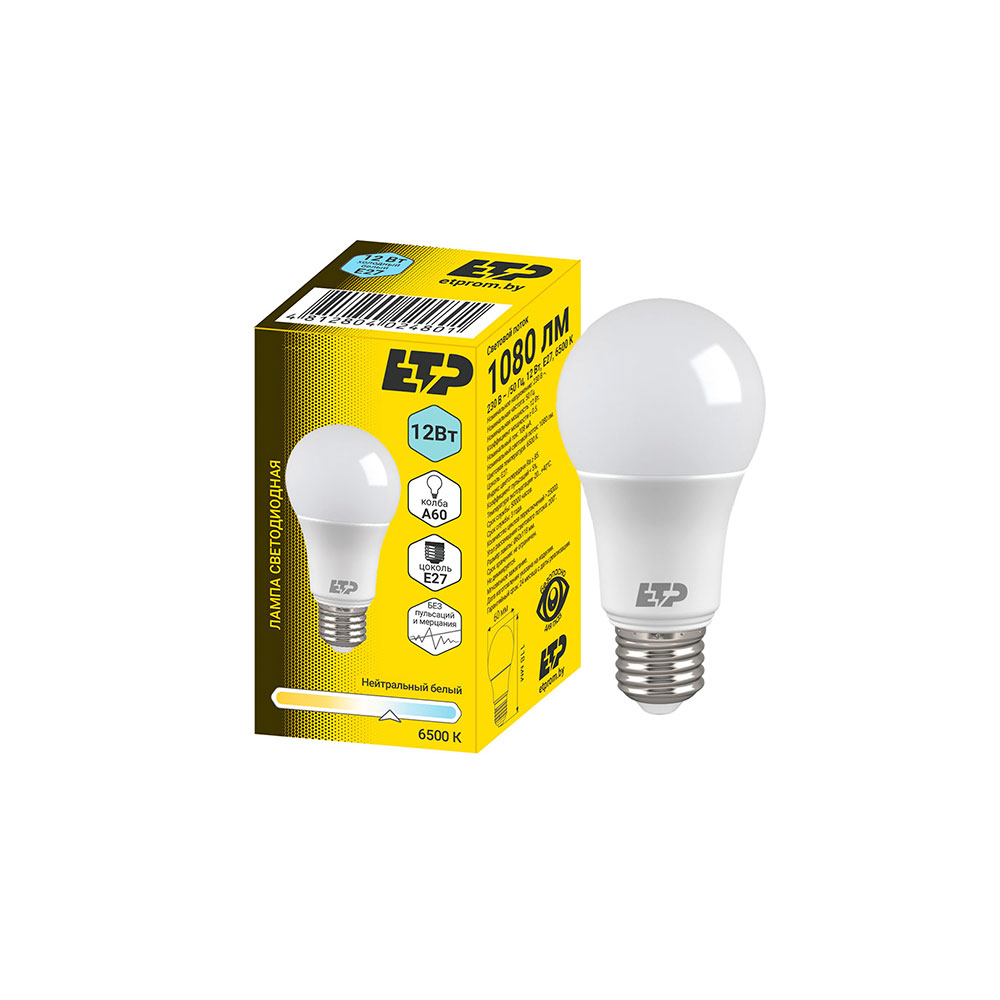Лампа светодиодная A60 12W 6500K (50) E27 ETP – светотехническое оборудование, в котором в качестве источника света выступают светодиоды (LED). Предназначены для освещения любых типов помещений, где соблюдены эксплуатационные требования по температуре и влажности. Могут применяться в светильниках любых типов, подходящих по размеру и цоколю. Светодиодные лампы являются энергоэффективным и экологичным аналогом энергосберегающих люминесцентных источников света и ламп накаливания.