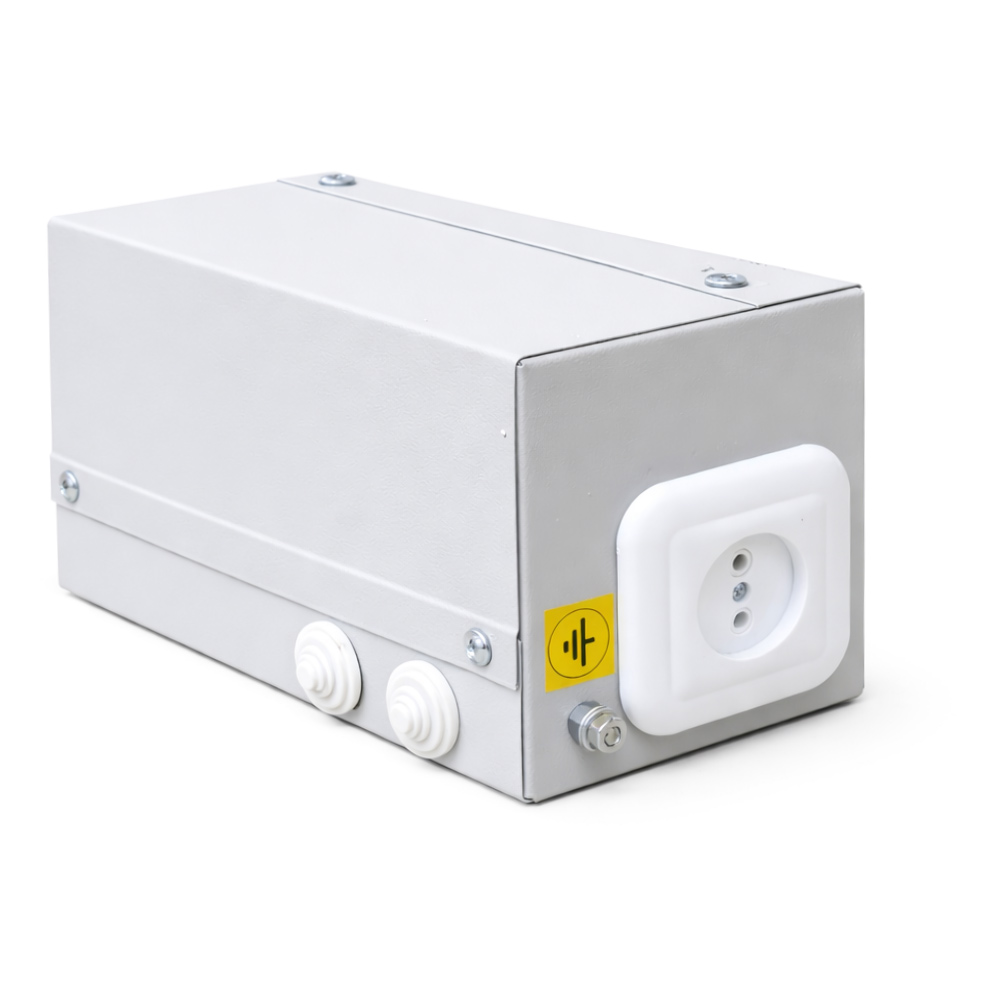Изделие представляет собой металлический корпус с закрывающейся крышкой, внутри которого смонтированы трансформатор, два автоматических выключателя и розетка. Такая конструкция позволяет использовать ящик как готовое решение для организации безопасного пониженного напряжения 24 В непосредственно на объекте. Благодаря наличию двух автоматических выключателей обеспечивается раздельная защита первичной и вторичной цепей, а также удобство отключения трансформатора от сети при обслуживании.