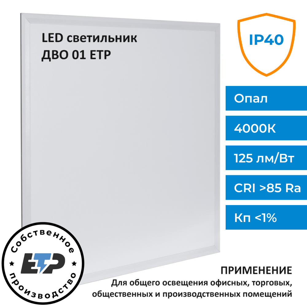 Светодиодная панель ДВО 01-1х40х001 УХЛ4 IP40 ETP с цветовой температурой 4000К применяется для общего освещения в торговых залах, в офисных и общественных помещениях, в административных и производственных зданиях. Благодаря качественному драйверу с надёжными электрокомпонентами, наши светодиодные панели ДВО 01 ETP отлично подойдут для использований в кабинетах со сложными компьютеризированными устройствами: в медицинских центрах, различных лабораториях, исследовательских центрах, серверных комнатах и т.п..